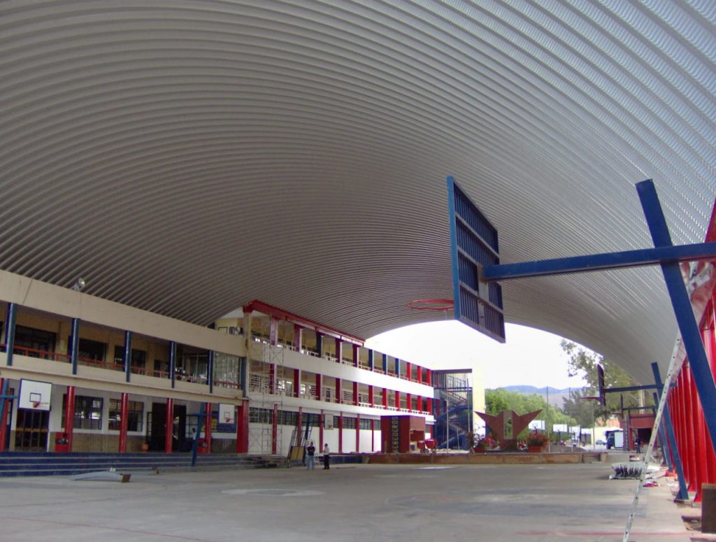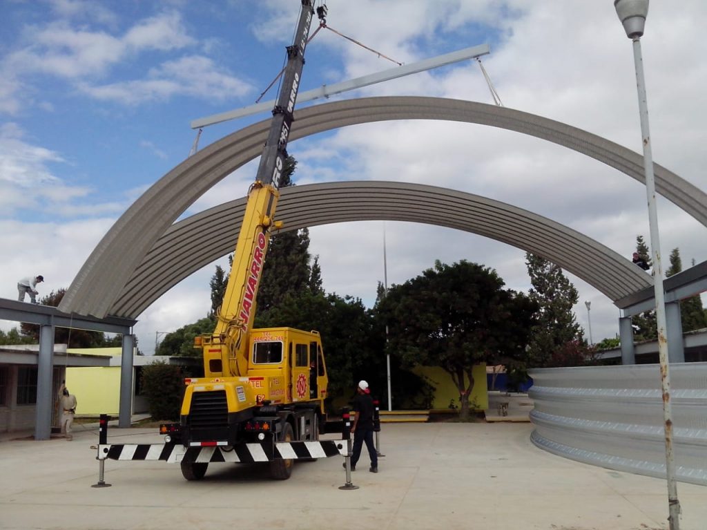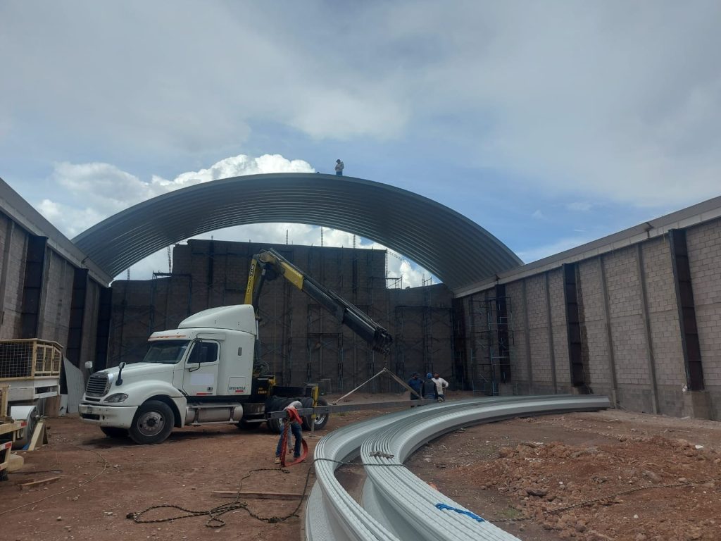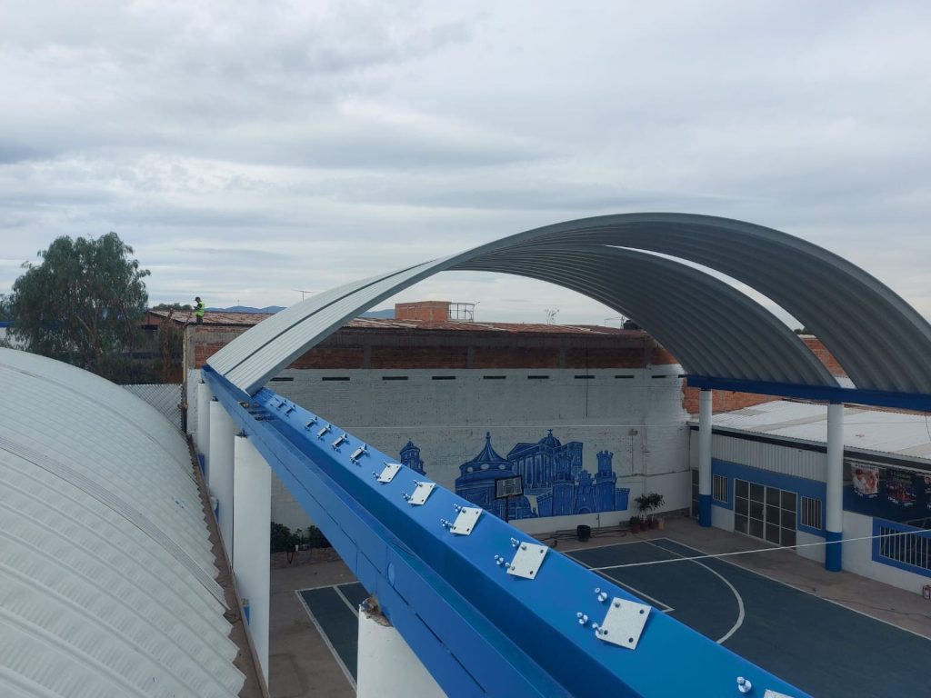 Sistema de cubierta a base de láminas de una sola pieza fabricada a pie de obra por una roladora portátil, fijadas en cada extremo con taquete expansivo y engargolado lateral continuo con equipo eléctrico.